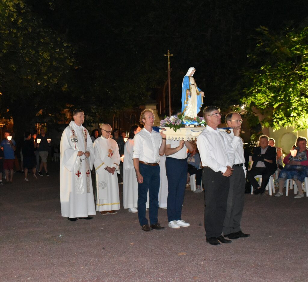 Processionner le 15 août, à la suite d’une représentation de la Sainte Vierge, ici à 21h au Parc du Château, signifie pour les chrétiens se mettre en route avec Marie pour vivre la mission, dialoguer, s’émerveiller de la présence du Seigneur qui nous précède, entrer dans le service du frère. Le 15 août, nous célébrons le Christ qui a élevé sa Mère au Ciel, qui l’a ressuscité et unit à Lui corps et âme. Marie, nous donne l’espérance à nous aussi de connaître la résurrection de notre chair promise au dernier jour.